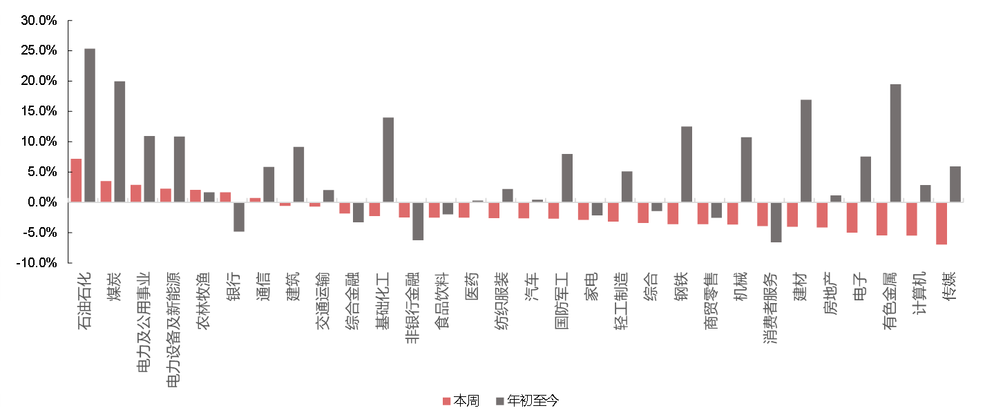 上证指数上周下跌0.93%,报收4124.19点,深证成指下跌2.22%,报收14172.63点,创业板指下跌2.45%,报收3229.3点。两市日均成交额26446亿元,上上周为24403亿元,成交额较上上周增加。周表现较好的行业为石油石化、煤炭、电力及公用事业、电力设备及新能源。(石油石化上涨7.18%、煤炭上涨3.50%、电力及公用事业上涨2.88%、电力及公用事业上涨2.25%;数据来源:Wind,2026.3.2-2026.3.8;行业分类为中信一级分类)