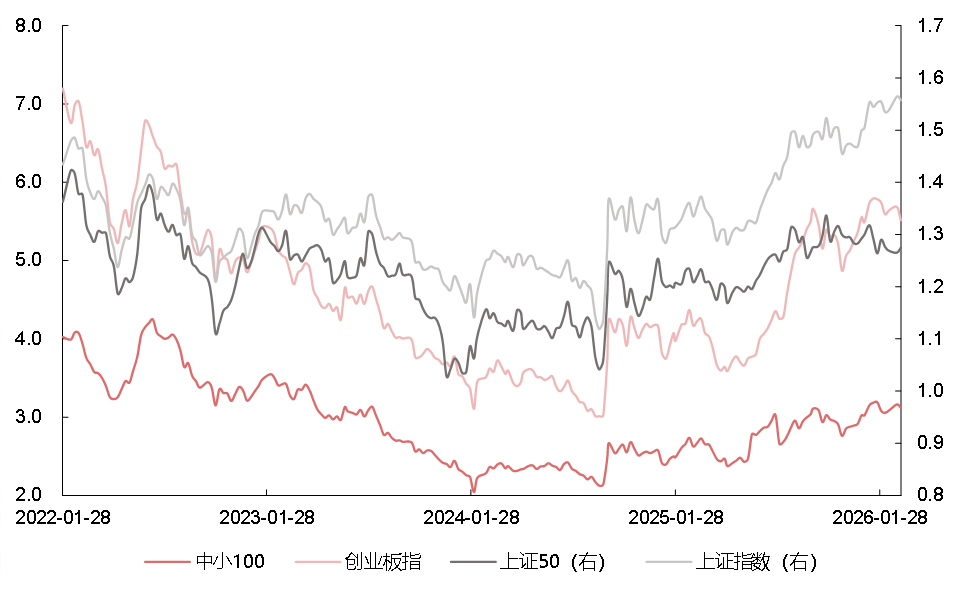 数据来源:Wind,2022.1.28-2026.3.8;左轴为中小100、创业板指的估值水平。