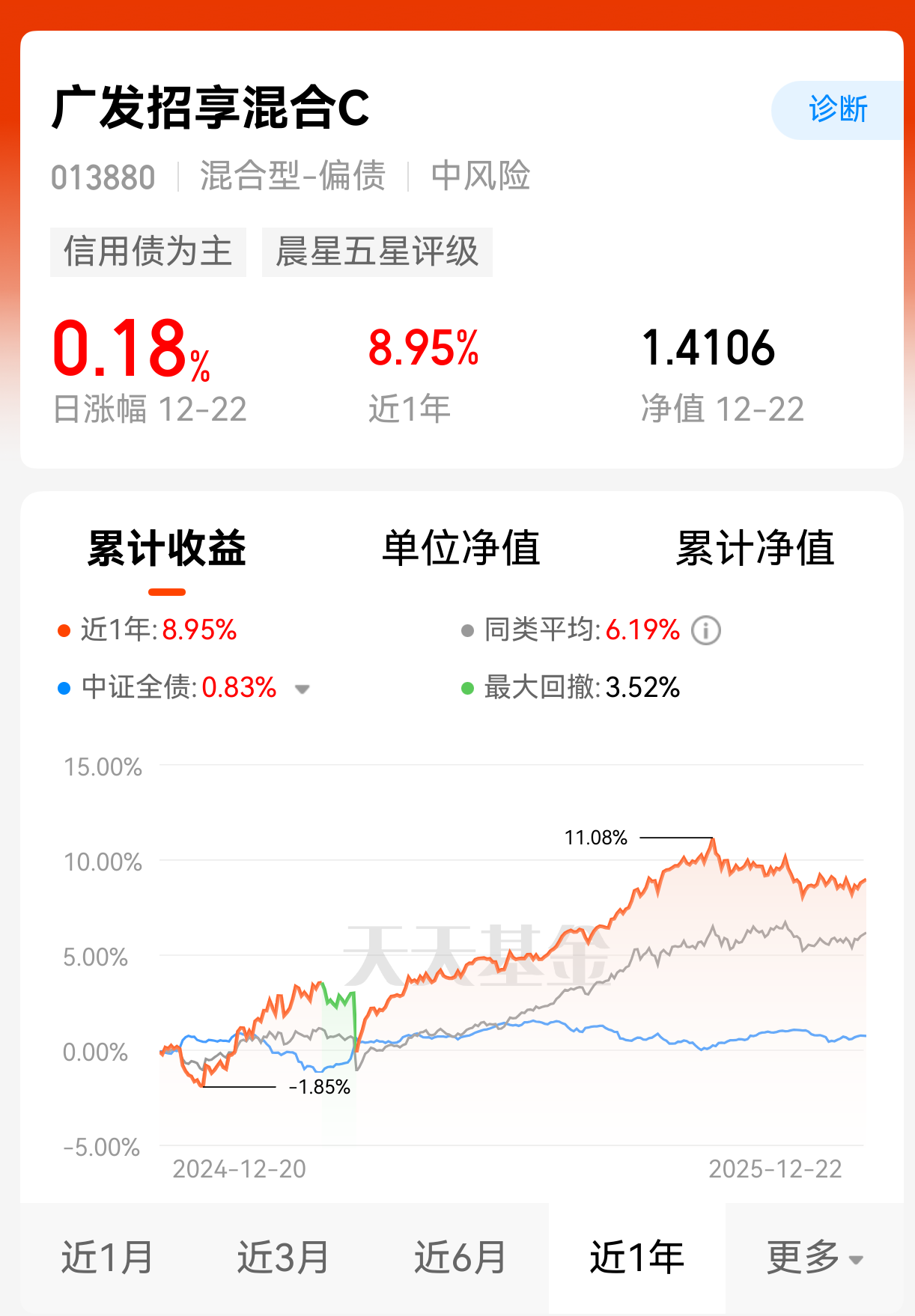 个人持仓的$广发招享混合C(OTCFUND|013880)$是一只固收+基金,今天收18个蛋,虽然今天债市不佳,但该基金持仓中有不超30%的A股和港股资产,权益市场反弹带动基金净值上涨,而前面权益市场大幅回调时,该基金虽然碎蛋,但基金有债基打底,可以有效降低风险,这也是个人在年底增加固收+基金配置比例的主要原因;另外,广发招享C中长期业绩亮眼,其中近一年收蛋895个,个人接下来会利用闲钱继续布局。