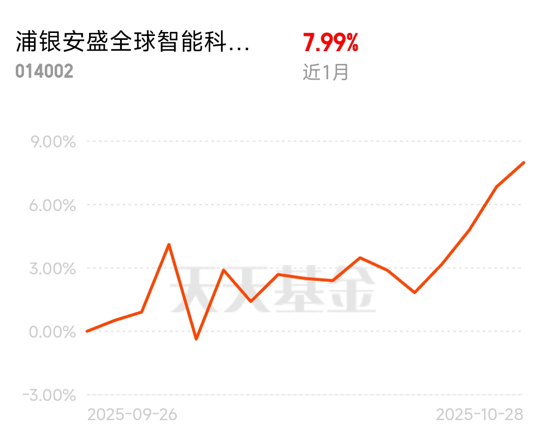还好我已上车了$浦银安盛全球智能科技(QDII)C$ ,今日更新净值上涨1.07%,强势持续上攻已实现4连涨,并且拉长战线看近六月收益40.81%,也是明显跑赢同类平均。主要是其聚焦的是美股市场人工智能、算力、智能驾驶等前沿科技领域龙头,集中度高弹性突出,也是频繁涨纳指。并且降息周期下有利于科技股估值修复,提振市场风险偏好,科技股也有望走出强者恒强行情。正是由于美股趋势依旧向好,投资热情高涨,不少QDII基金已经限额,而我选择这只浦银安盛不限额,也能更好的跟上行情咯。