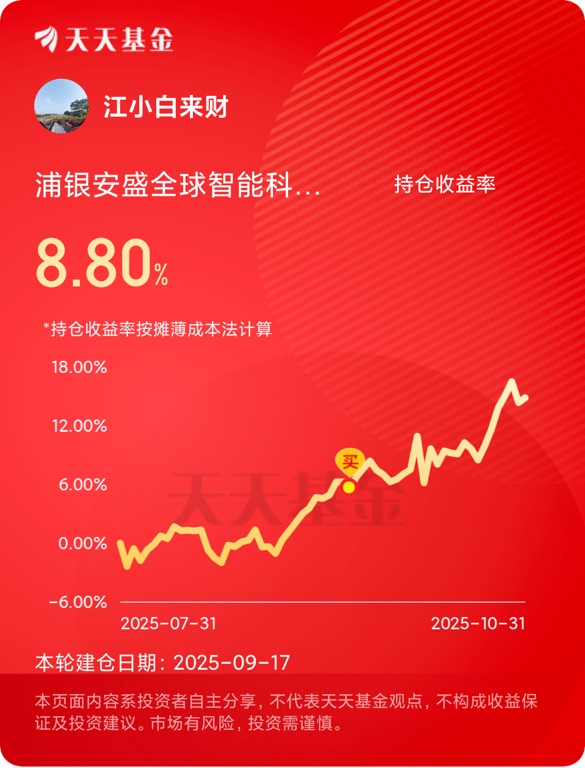 浦银安盛全球智能科技可以3-5年长期持有,开启周定投就当变相养成存钱习惯了,想乱