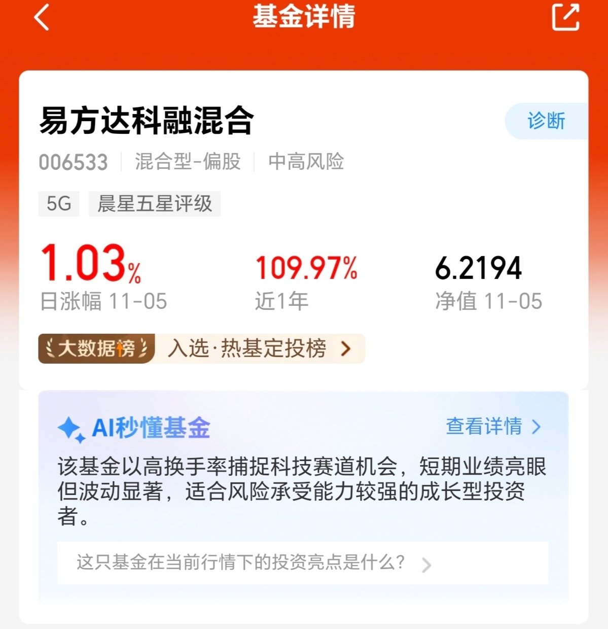 今日A股市场迎来全面吃肉行情,科技赛道整体涨幅力度喜人,不过当下成长行情轮动较快,想要跟住这波牛市趋势,还不想波动过大,我觉得还需要均衡布局呢,我发现$易方达科融混合$ 不仅仅配置了科技赛道,同时还聚焦于反内卷相关新能源,事实证明,基金经理能力确实很强,近一年涨幅高达124.78%,同时持有结构里面机构占比较高,说明了对其产品的认可程度,我也打算定投起来啦!
