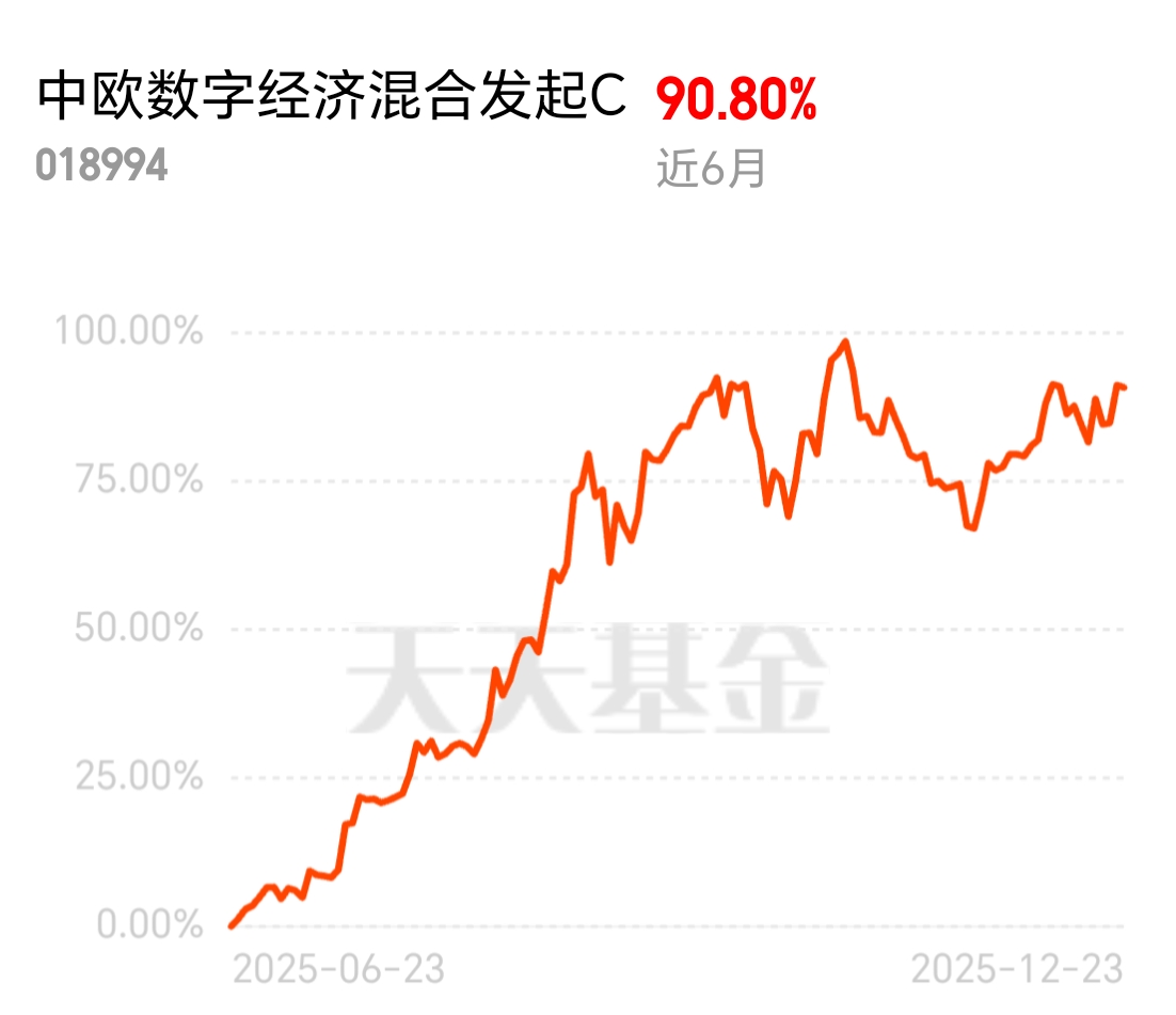 数据要素流通机制不断完善,全国一体化数据市场加速形成,AI 产业天花板极高,中欧数字经济混合发起 C 近 6 个月涨 90.80%,重仓政策支持的核心赛道,长期成长动力足。$中欧数字经济混合发起C$