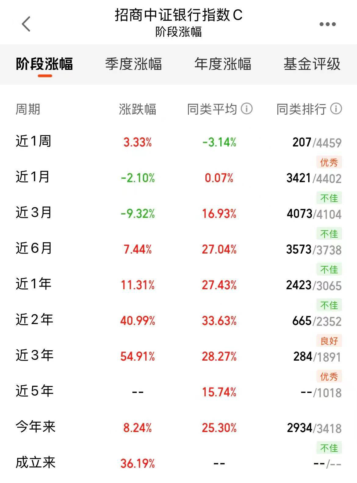 今天A股迎来反弹,上涨的个股比较多,不过板块还是分化明显,比较科技、军工等继续调整,银行、红利等稳定性强的板块继续上涨,$招商中证银行指数C(OTCFUND|014028)$昨天上涨2.38%,近六个月涨幅7.44%,近一年涨幅11.31%,持仓有招商银行、工商银行、农业银行等大行,震荡行情下,是不错的避风港湾!