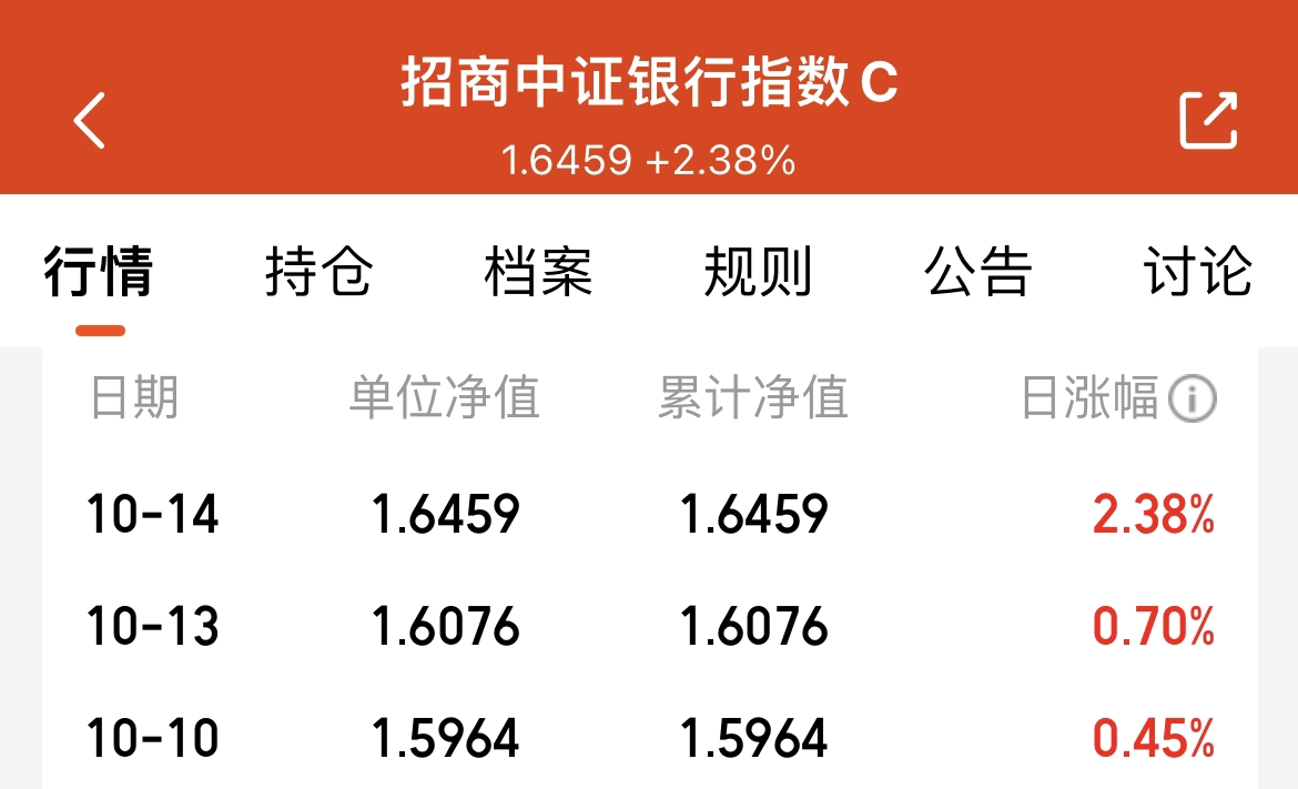 昨日大盘震荡调整,银行板块却逆势收红,防御属性凸显!今日板块热度持续延续,资金不断流向低估值、高分红赛道,行业配置价值进一步凸显。$招商中证银行指数C$紧密跟踪中证银行指数,专注银行业核心配置,昨晚更新涨幅2.38%,并且连涨了3天,作为红利策略的核心标的,银行板块股息率优势显著,在当前市场波动加大的环境下,这类兼具稳健性与收益性的产品,配置价值突出,个人还是很看好的。