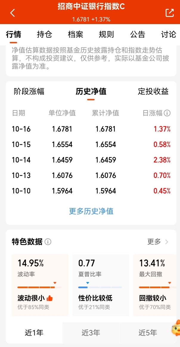 今日大盘三大指数低开低走,继续震荡调整,也就银行早盘还在坚挺着,果然避险还是要选$招商中证银行指数C$ 银行这类防御板块, 银行这波上涨趋势也起来了,近一周涨幅超+5.59%,同类平均还跌了-3.19%,连红五天,给力呀, 后续还有降息的利好,银行板块估值会得到很好的修复,四季度还是多配置点银行安心些,你们说呢?