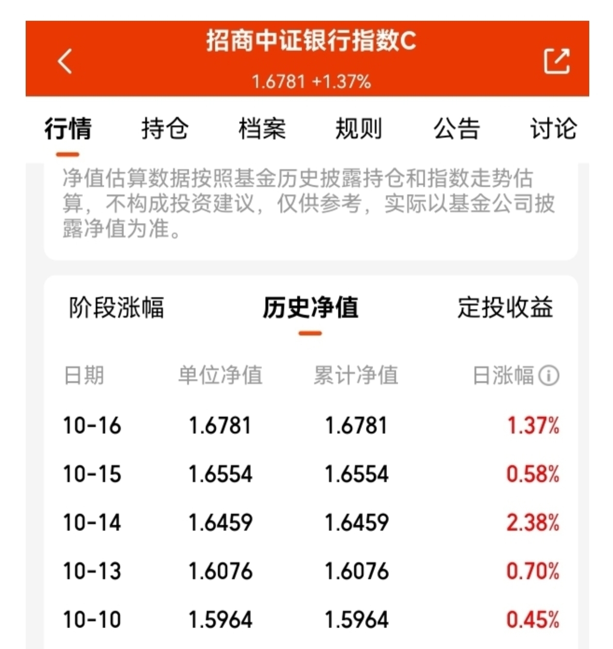 今天市场整体走势比较弱,三大指数开盘就往下走,行情确实不太乐观。我注意到银行板块表现还挺稳的,特别是$招商中证银行指数C$ 最近一周逆势上涨了5.59%,而其他板块平均跌了3%多。这周已经连续涨了五天,确实比较抗跌。我觉得接下来可能会有降息政策,这对银行股估值修复是好事。我自己打算在四季度多配置些银行板块,感觉拿着更踏实。现在这个行情,还是选择防御性强的板块更稳妥些。