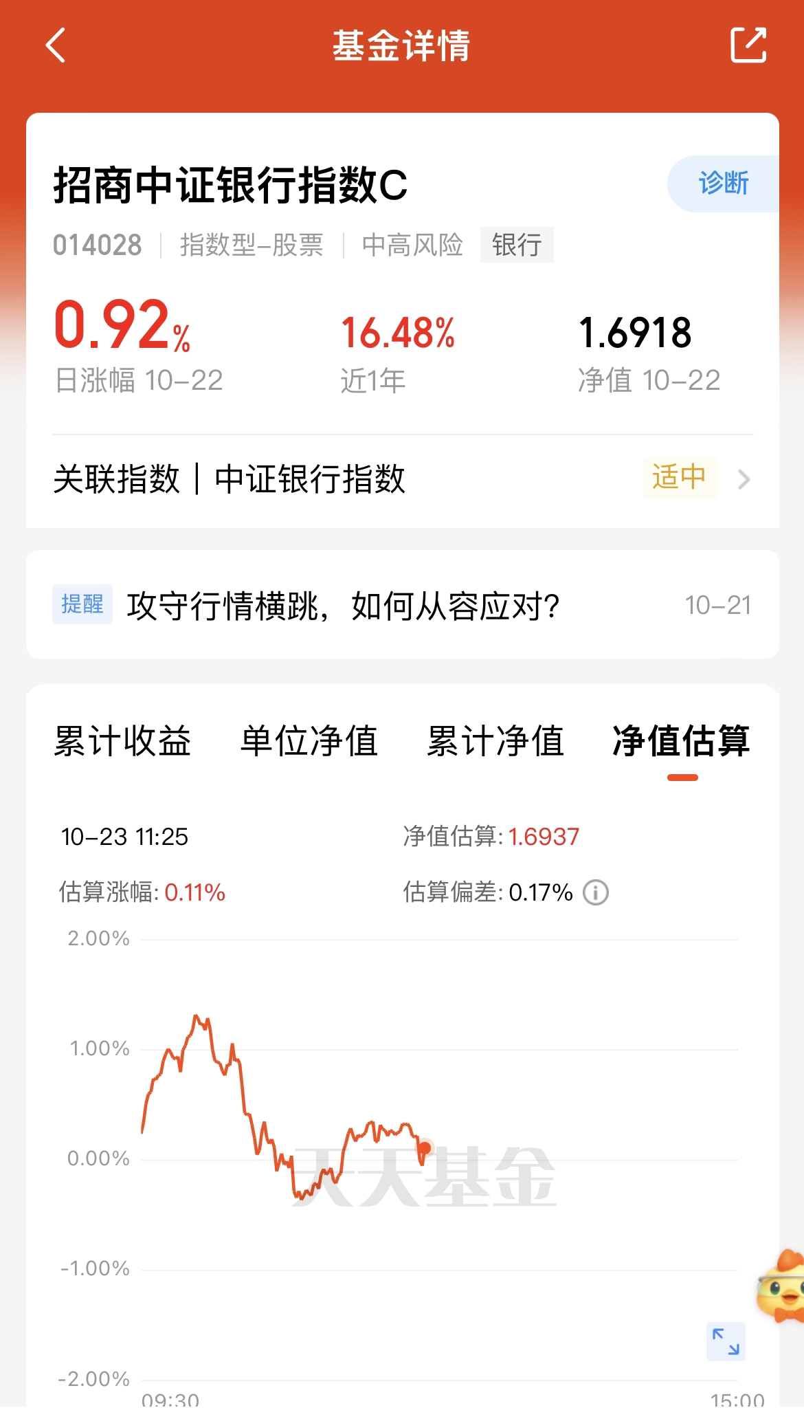 今天大盘震荡调整,午盘三大股指依旧下跌, 随着市场波动加剧,资金偏好转向稳健资产,龙头股农业银行持续上涨并创下历史新高,带动板块整体抗跌性凸显。$招商中证银行指数C$ 紧密跟踪银行指数,一键布局行业龙头,市场震荡中更是连涨2天。在当前科技等成长板块波动的情况下,银行板块作为防守配置还是不错的。
