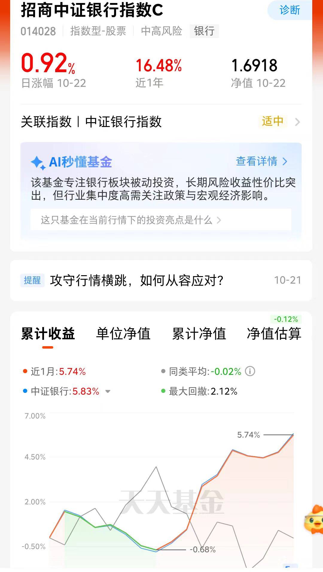友友们,最近股市震荡,大家避险需求增加。近期农行持续上涨,创历史新高了,市场避险效应提升,我今天打算加仓$招商中证银行指数C(OTCFUND|014028)$,昨天逆势上涨0.92%,近一个月上涨5.74%,波动小,防御性强。时候做底仓配置。