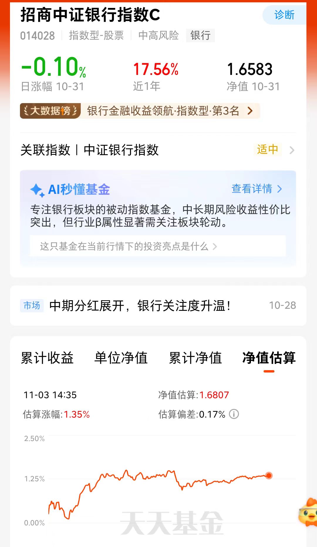 友友们,今天股市行情惊喜反弹,有要开启11月开门红了。公募基金业绩比较基准新规带来的利好意味着,这些低配了银行股的基金,现在面临着将仓位“加回来”到基准权重的压力,从而带来增量资金,利好银行板块,我关注的$招商中证银行指数C(OTCFUND|014028)$,今天估值反弹1.35%,我打算上车了。