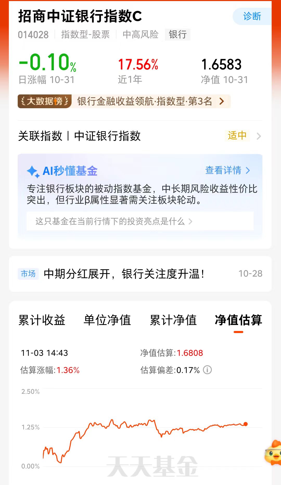 今天股市行情震荡反弹,公募基金业绩比较基准新规带来了利好,银行股作为高股息、价值型资产的市场定位,资金有望稳定流入,对银行股的配置需求增加,$招商中证银行指数C(OTCFUND|014028)$今天估值上涨1.36%,修复能力强,可以关注一下呢。