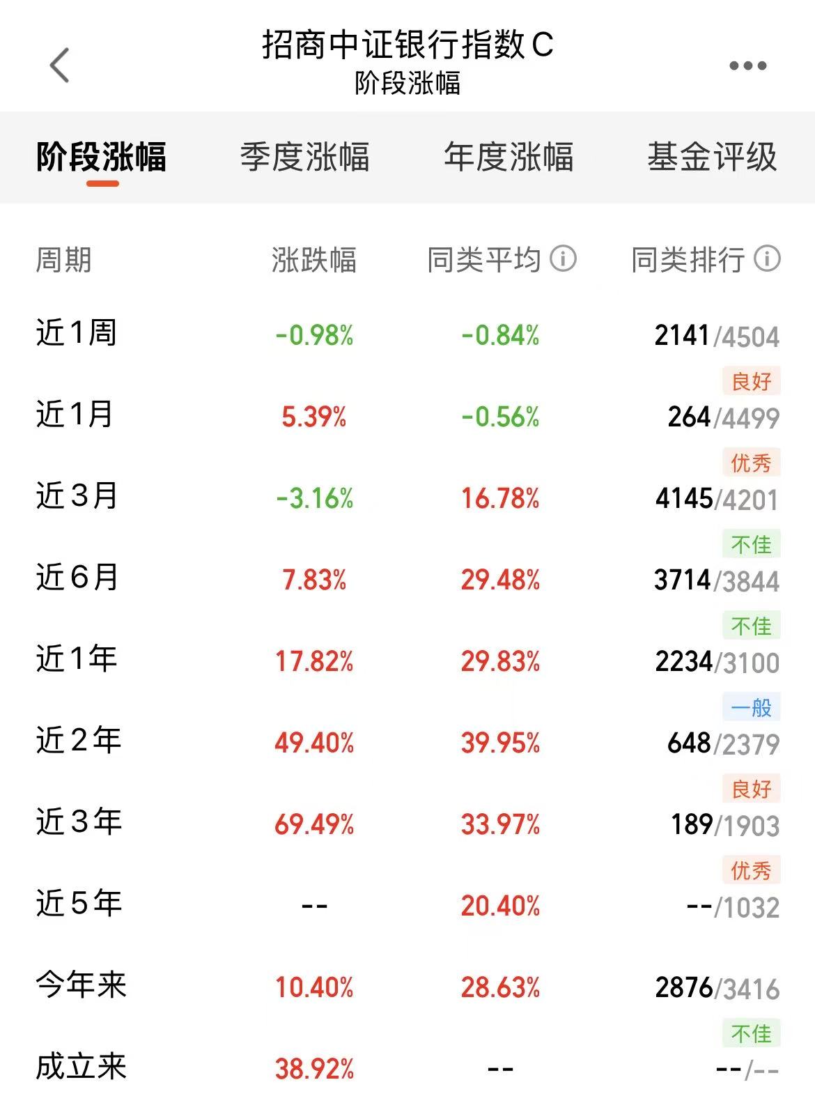 大盘继续震荡回调,我都连续吃几天面了,太难了呢!今天的科技还在震荡,防御的红利、银行等板块稳住上涨了,眼下,宽财政+稳货币组合推动基建投资增速回升,资金慢慢的回到防御稳健的方向,还好我也是均衡持仓,今天可以对冲收益呢!$招商中证银行指数C(OTCFUND|014028)$近一个月涨幅5.39%,近一年涨幅17.82%,业绩是不错的!