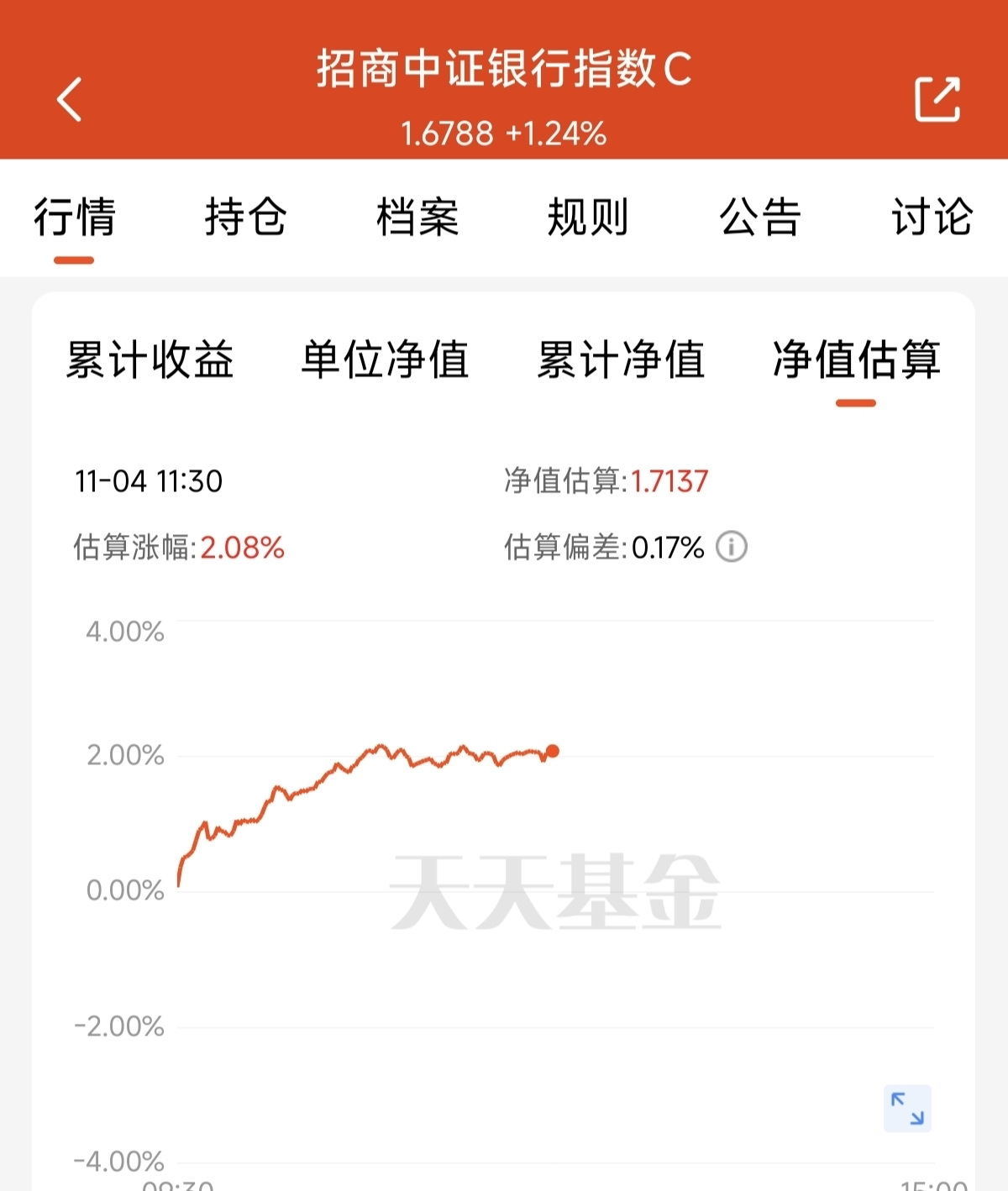 $招商中证银行指数C$ 这只聚焦银行的指数基金。紧密跟踪中证银行指数。一件全部打包了银行龙头。今天估值又涨超了两个点。昨天上涨了1.24%.同类业绩也是长期做到了优秀。基金跟踪指数精准度高。看好本轮行情中继续突破创新高。