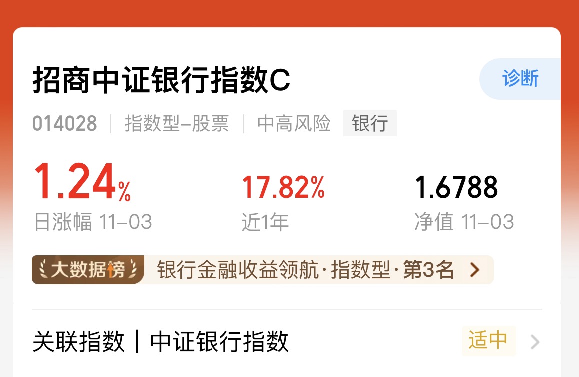 最近市场轮动挺快的,前阵子火得不行的科技板块现在开始震荡调整了,今天走势也挺分化的,基金这边追高的热情也不高。反倒是银行这种避险资产,今天表现不错。这么多里面,我还是最看好那只$招商中证银行指数C$ 的基金,它主要跟踪银行板块,昨天单日涨了1.24%,今天看估值也还行,打算继续关注一下