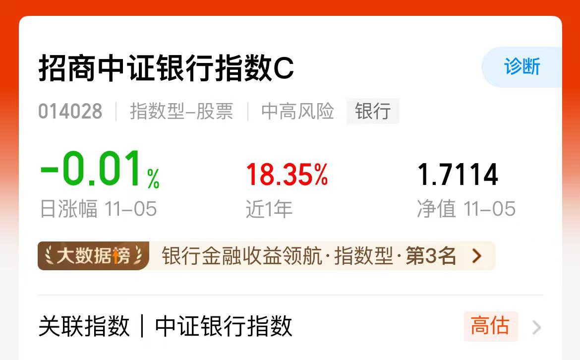 近期银行板块在市场中还是比较亮眼的,在市场的震荡中展现出强防御性和高股息的特征。$招商中证银行指数C$ 这支基金紧跟行业龙头,受益于政策持续发力,流动性改善以及息差企稳预期。板块估值仍然是在历史低位区间,随着新规落地,经济回暖,银行板块有望迎来估值修复。