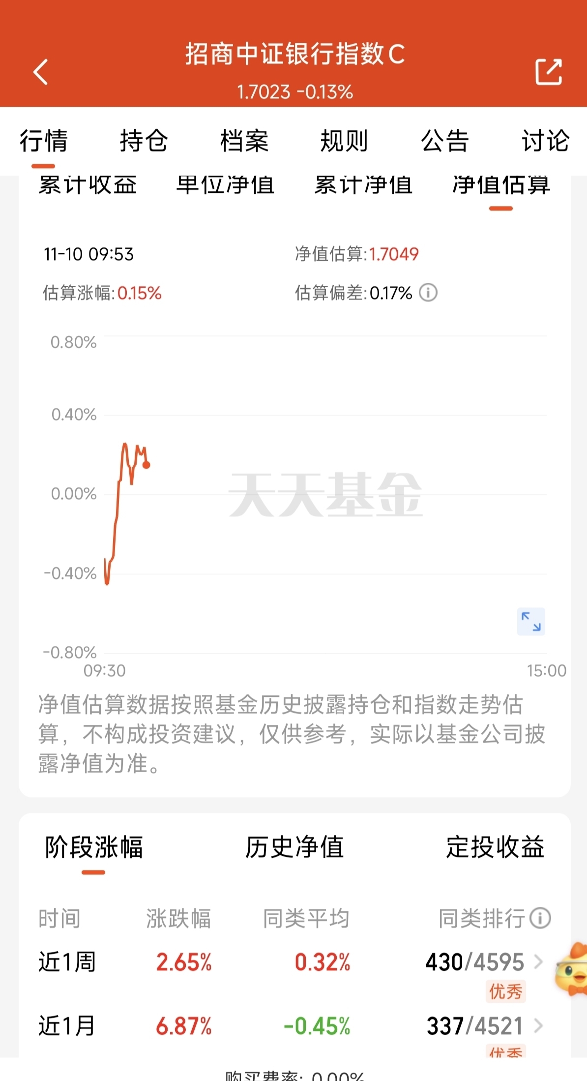 $招商中证银行指数C$ 这只聚焦银行的指数基金。紧跟跟中证银行指数,一键打包全市场优质银行资产,长期表现的稳定性是非常好,近一周上涨了2.65%。近1月上涨了6.87%。而同类平均业绩都是负收益,基金紧跟指数,精准度高,而且费率方面同类也比较低,我看好银行长期的稳定表现。