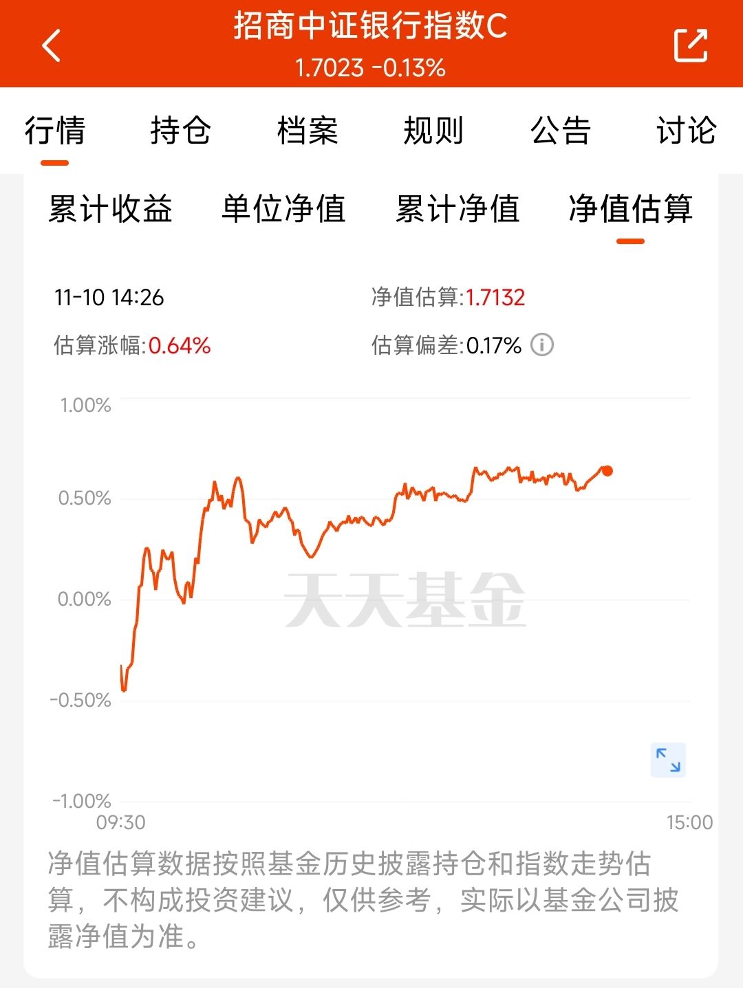 今天银行板块低开走高,但三季报企稳,叠加银行化险或将进入新阶段,预期利好正在加速兑现。盘中行情拉升,$招商中证银行指数C(OTCFUND|014028)$估值收涨 0.64%,当前市场资金避险偏好明显,更偏向银行这类低波动高股息资产。这只基金近一周涨 2.65%,从绝对收益角度看,银行板块基本面依旧稳健,长期收益稳健可期。