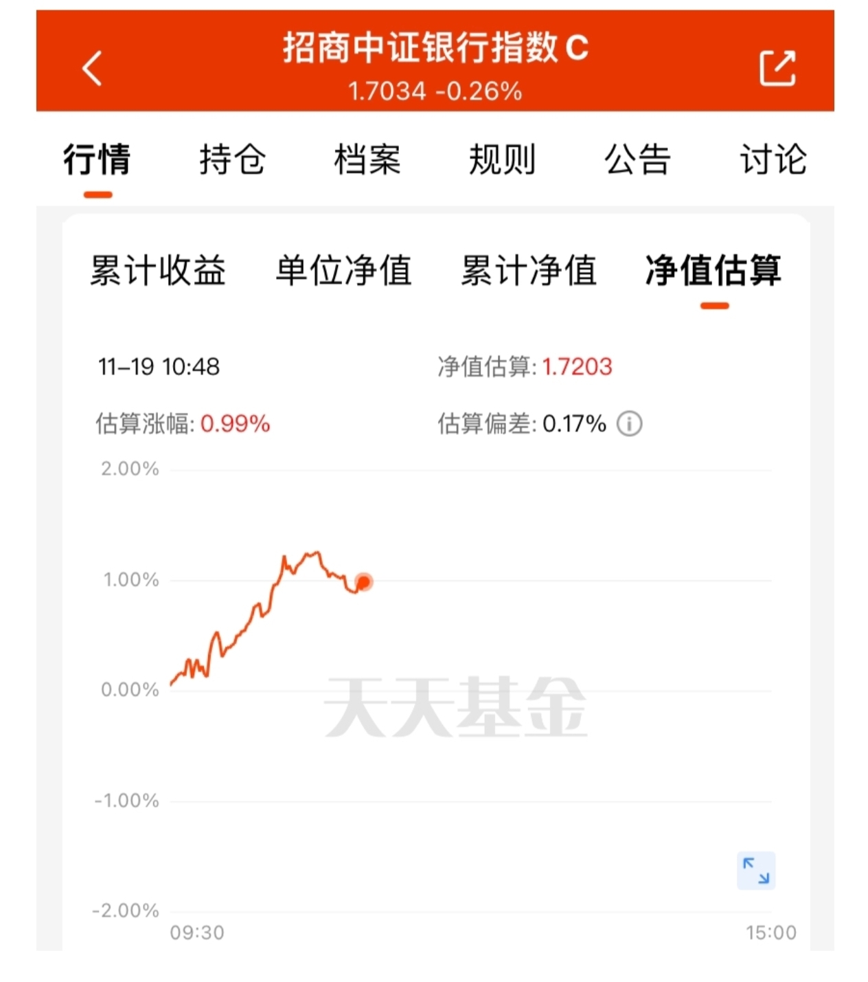 今天市场开盘后逐步回升,但不同板块表现差异很大。在题材股调整的同时,银行板块出现明显反弹。我看了一下招商中证银行指数C,这只基金跟踪银行板块整体走势,今天盘中涨幅接近1%,跑赢了大盘指数。最近市场波动加剧,我觉得适当配置一些银行这类相对稳健的品种,可以帮助平衡投资组合的风险。银行板块通常波动较小,在市场震荡时期往往表现比较稳定,这也是我关注这类产品的原因。