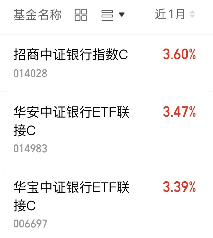 $华安中证银行ETF联接C(OTCFUND|014983)$近一个月涨幅3.47%