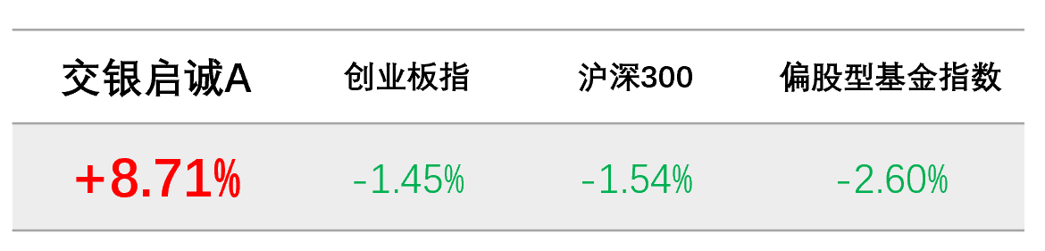 数据来源:基金走势来自基金定期报告,指数走势来自wind,截至2025.9.30,交银启诚成立以来收益率为38.01%,同期创业板指为-5.38%,科创50为1.88%,上证指数为10.01%,沪深300为-5.72%,交银启诚的业绩比较基准为-5.72%。基金的过往业绩并不预示其未来表现,基金有风险,投资须谨慎。