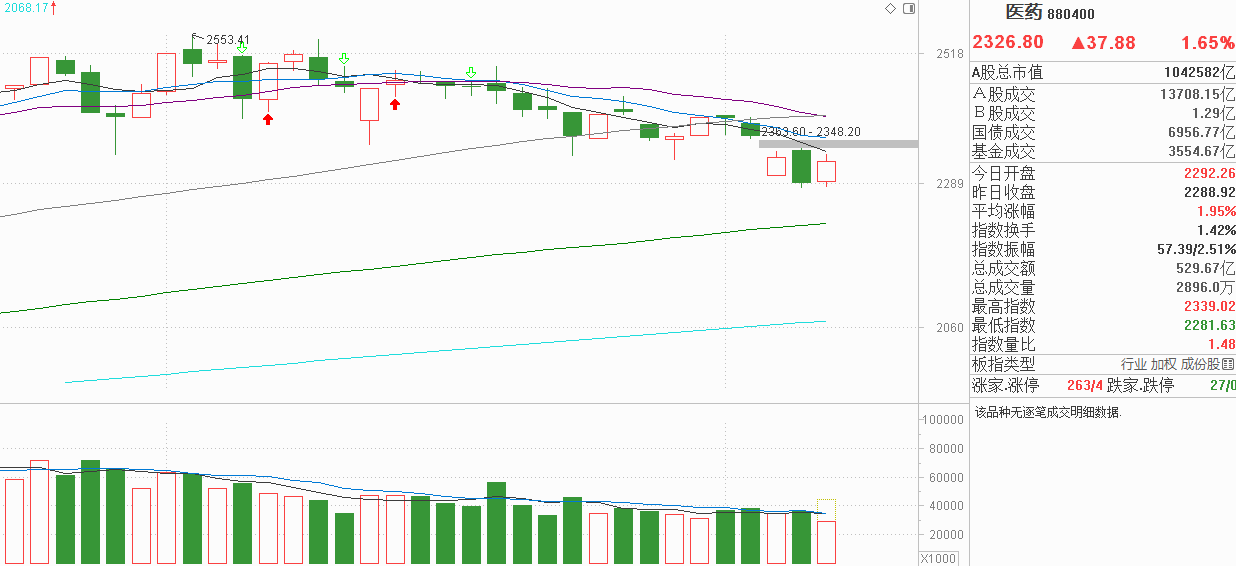 家人们,咱们聚焦一下医药!昨天高开低走中阴反包周一本来的低开高走假阳线,其实是连续三天下行并破位8月横盘箱体的表现,昨天我认为箱底击穿还能修复,但必须要快要急,不能大幅破位后才反弹,这样均线已经全拐头向下,越往下走抛压越大。今天医药小阳反弹一度反抽5天线,但未收复昨天的中阴线,从高点看只是回到箱底的阻力区,并未有效站回箱体内,市场风险还没有解除,在技术上看,这算是反抽不成功的表现。如果刚看到医药小阳反弹就认为止跌企稳,在当下行情中是有小概率成功的,这种低概率企稳对大部分资金来说是一个冒险的行为,医药本就是防御性质的,我觉得真走出反包阳线或确认站上5天线后,才有可能重新走好,因此反抽小涨一天意义不大,多头得继续发力才行。