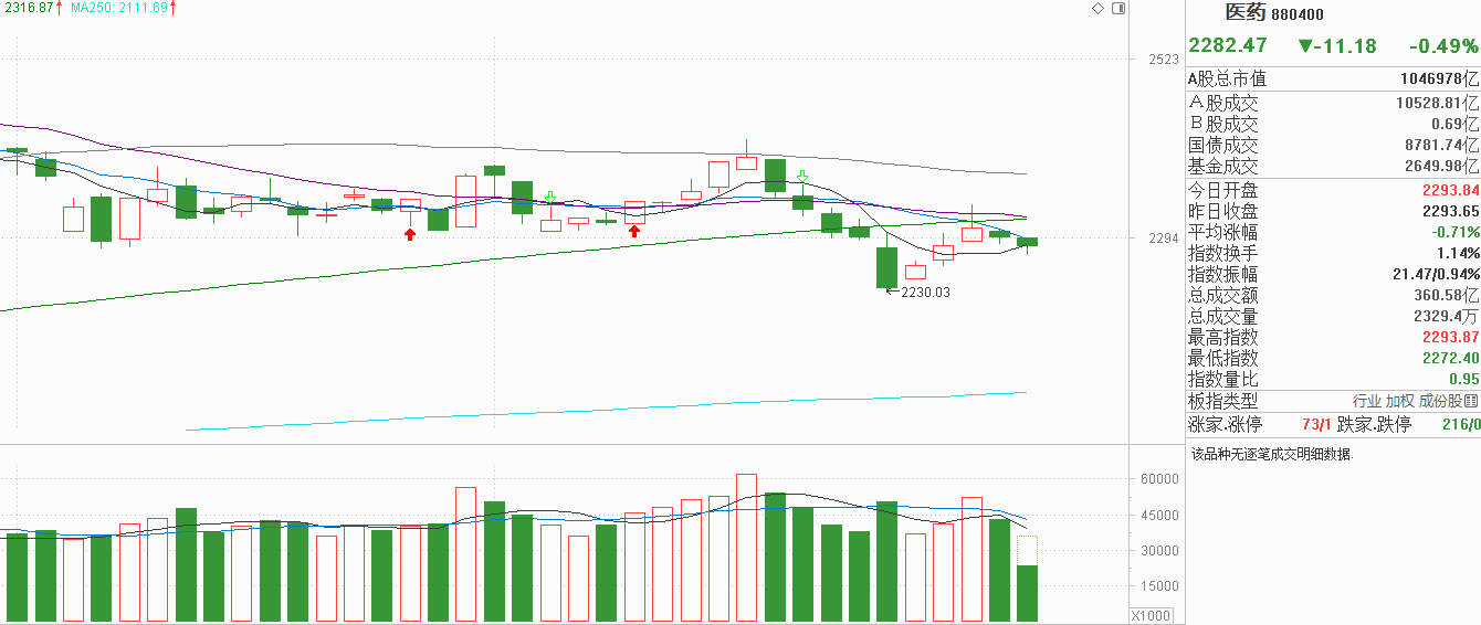 医药周三中阳反弹至20天线冲高回落,上影线比较长,说明20天线的抛压比较大,按医药依然是震荡行情看,有阻力当然是先消化,昨天医药低开低走主动回调,我认为是符合预期的,只是昨天的下影线非常短,支撑并不明显,今天10天线继续下行,医药只能继续向下探代支撑。目前医药被10天线压制回踩5天线后回升,下影线暂时比昨天长,位置也刚好到支撑区,我认为医药的回调力度也就这样,把周三因为流感概念带动的题材效应全部清除,重新回到正常的震荡修复中当下医药依然在10月箱底附近波动,并没有明显的破位信号,最坏的预期也就是复制10月近乎没有波动的表现,也没有必要看到回调就担忧,看到上涨就兴奋。医药能涨的核心依然是业绩面的改善,创新药估计是业绩最好的方向。或许只能等待新增资金持续有力度的流入带出拐点,否则每到箱底偶尔看一看会不会破位就够了,干着急没用。