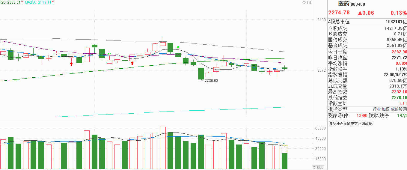 各位关注医药的朋友们,我给你们泼盆冷水!上周五小阴调整尾盘探底回升,下影线是上周最低点,说明重心是下行的,而且并没有收复5天线,说白了还是弱震荡,很低迷,没资金流入。周末不少医药公司公告纳入医保,按理说虽不及证券那样多的利好,但总比没有强吧?今天市场放量医药仅微幅高开就继续震荡,虽然5天线是站上了,但没有任何明显的资金流入,更是是一种漫无目的的随机波动。这种走势你告诉我医药走好了,我是不相信的。目前我只能确认的是医药在8月见高后经过长达4个月的震荡,抛压基本释放干净,但也没有增量资金的流入,当前还是沿着下行的均线阴跌为主,提前潜伏的不确定性还很大,甚至还有创新低的风险,像证券那样突然出现资金流入形成市场拐点,可能更靠谱一些。