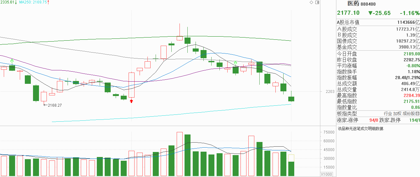 医药上周五一度小阳反弹,但很明显被10天线反压冲高回落还小阴调整创1月14号后的调新低。由于医药上下跌趋势,上影线出现代表抛压又加大了,次日继续向下回落寻找支撑才是正常的。今天医药低开后并没有向下测试支撑,反而再次上行,如果真出现阳线并把上周五上影线反包了,这也话能说是资金流入的信号,结果是医药冲高回落继续以上影线表现,市场重心进一步下移快要击穿12月的新低,我觉得这种没钱硬上的态度是最不可取的,只会引来更多的抛压,一旦12月低点被击穿,医药有可能会重回2025年低点甚至是2024年的低点,以后的事谁都说不准,但现在就是资金在流出,风险不得不防。白酒好歹还有存量愿意挣扎一下,医药算是凉拌了,没资金持续流入前我认为要远离医药方向。想知道医药还能不能找到底部的支撑?会不会真的跌入历史谷地?