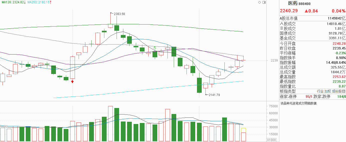 医药昨天小阳反弹至60天线后回落至20天线,上影线代表抛压,结合医药连续上涨6天,短线有一定的获利盘,我认为这种表现是正常的,没有超预期的表现。按下跌行情观察,出现上影线次日向下探找支撑更是规律,但医药今天好像没有这种表现,是小阳反弹再测试60天线后回落,20天线虽然还是下行的,但没有明确失守,5天线也开始向上掉头,看上去挺像企稳的信号。我这样认为,医药目前中短长线全是下跌趋势,此前也不是单边下跌,也有本轮类似的连续上涨,最近的是元旦后中阳反弹后持续上行,那一些比本次反弹要强一些,可是医药近期却创了年内新低,即上一次反弹还是无效的,目前本次反弹依旧没有出现有力度的中阳线,基于这样的对比与现状,我认为医药仅是下跌趋势中的反抽,反抽结束后依旧还是会创新低,尽管基本面估值很低,可市场就没有资金流入,只有尊重市场,顺应趋势,起码我会回避这个方向。