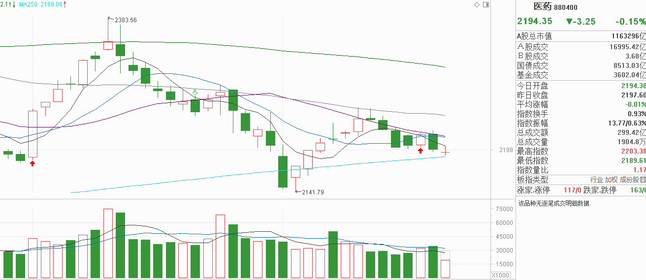 医药昨天高开冲高未能守住20天线单边下行,把周三的反弹阳线反包了,由于前期还有四连阴,这种走势明显就是抛压明显强于买盘的表现,而且20天线明确出现阻力,如果短周期没有构成技术乖离,就凭医药现在的极低人气表现,可以说大概率没有可能出现企稳信号。今天医药在昨天阴线下方窄幅震荡,年线上移到位也未能出现反弹,已经宣告了医药现在虽未跌破年线,实际上已经有破年线再创年内新低的风险了。现在唯一能做的观察是医药千万别说自己的制药的,是化工板块精细化工分支,别把化工拖累就是它作为一个老登板块最后的作用,至于是不是全部打入ST我倒是没有意见,都跌了5年了在短周期,中周期和长周期依然没有改变的情况下,谁知道还能跌多久,没有看到做多资金的情况下,回避了这个方向,就是对投资最大的保护。