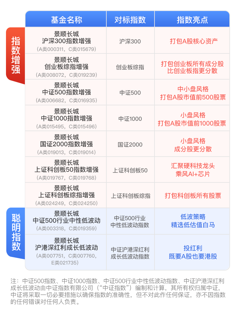 立足当前市场环境,如想提升组合的进攻属性,风险适配前提下,或可关注、$景顺长城创业板综指增强C(OTCFUND|019239)$、$景顺长城科创50指数增强C(OTCFUND|019768)$、$景顺长城上证科创板综合指数增强A(OTCFUND|024249)$、$景顺长城上证科创板综合指数增强C(OTCFUND|024250)$。前者对标的创业板综指是创业板市场的全样本指数,不仅纳入创业板龙头,也兼顾一大批潜在成长空间较大的创业板中小盘,呈现出更高弹性的特征;科创板方面,上证科创板50指数汇聚硬科技龙头,集中度更高;上证科创板综合指数覆盖所有科创板股票,覆盖芯片半导体、新能源、军工等多领域,单一行业依赖度低