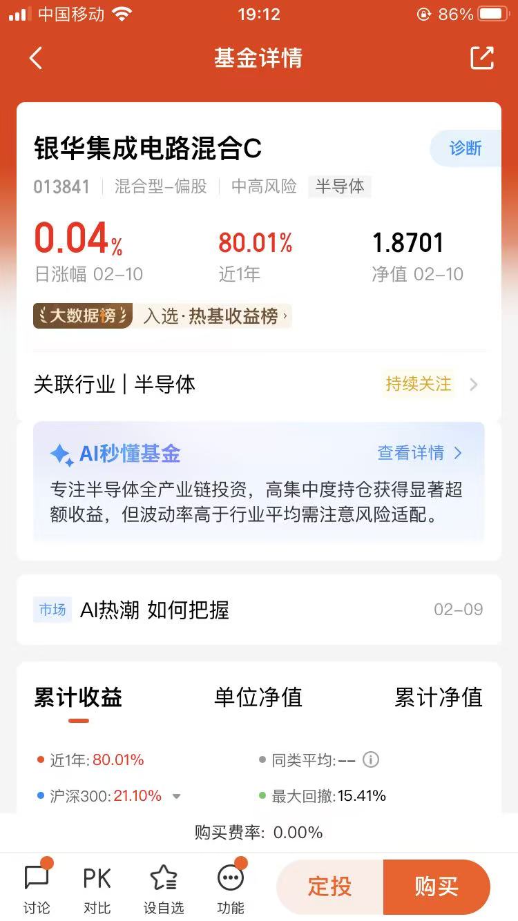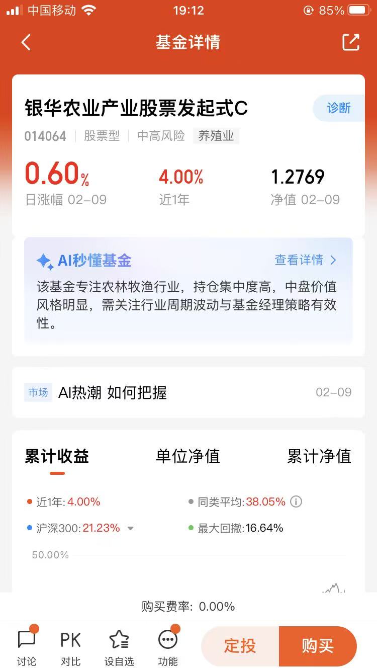 先说说其他几个板块为什么我没选。半导体确实是长期好赛道,AI驱动下需求也足,但前段时间涨得太猛了,估值已经不低,短期回调压力不小,现在进场,很容易高位站岗,咱们普通人扛不住这种波动。光伏呢,近期行情起起落落,2月10号还跌了1.56%,虽然长期有发展,但短期受出口退税调整、机构资金分歧的影响,盈利承压,而且板块分化太严重,不好选标的,新手很容易踩坑。$银华农业产业股票发起式C(OTCFUND|014064)$