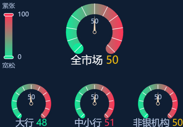 六、资金面情绪指数:全市场50 资金面维稳(0-100紧张度递增,50为均衡,超过50反映资金紧张)
