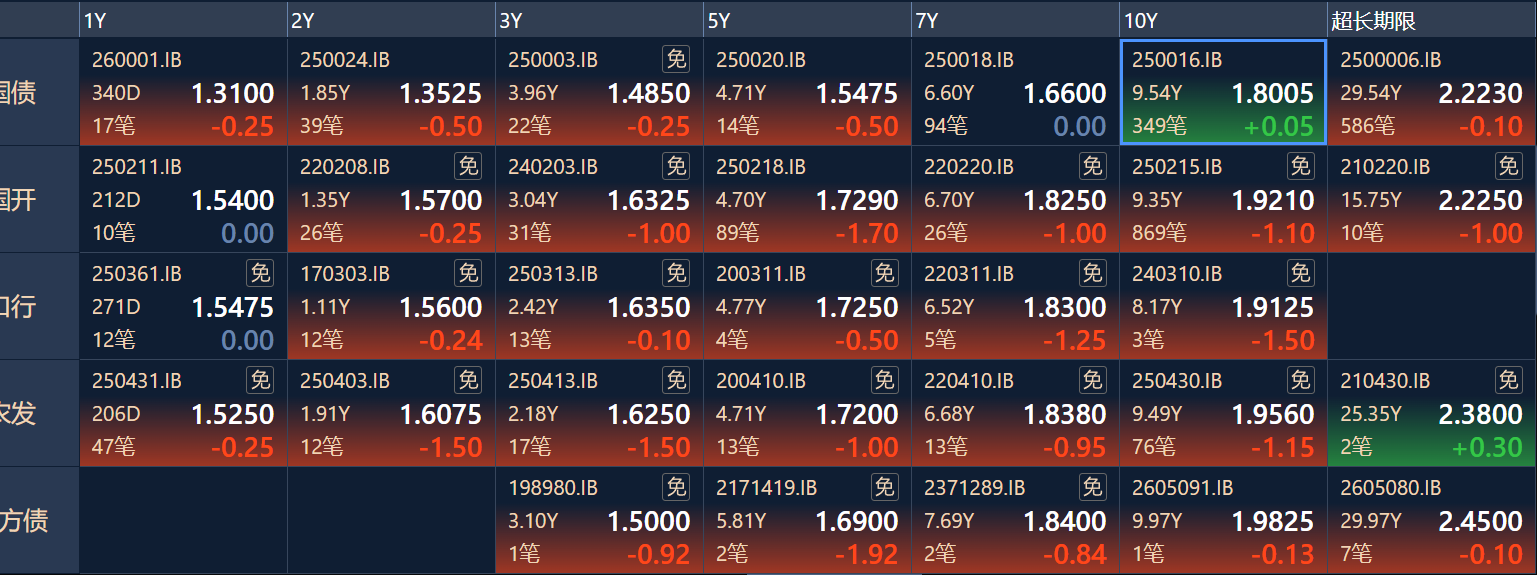 二、十年期国债收益率:1.8005 0.0005%(国债收益率越涨,债市越跌,两者反向关系)