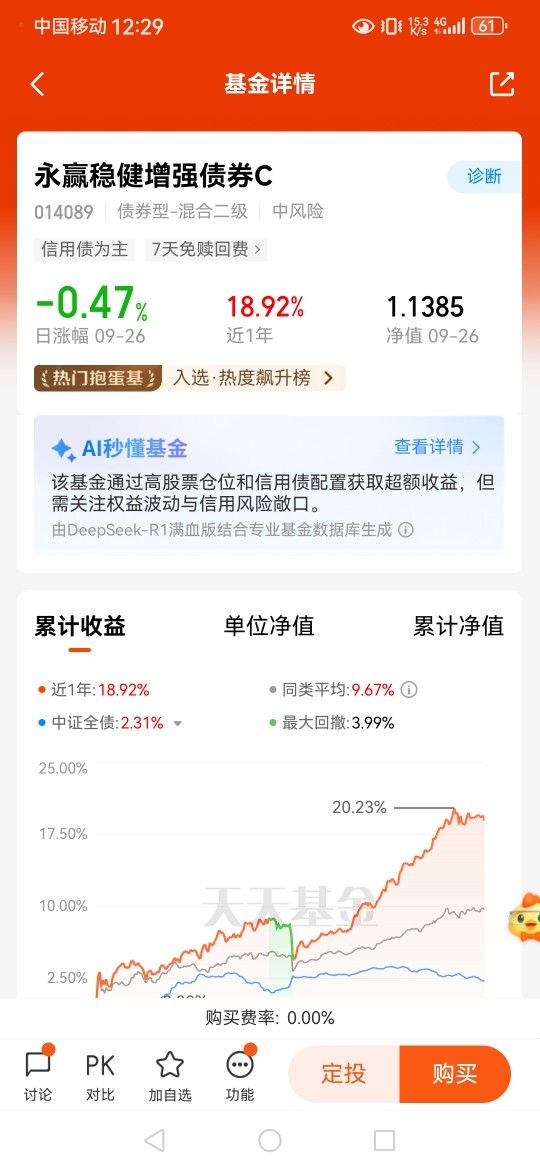 $永赢稳健增强债券C$ 是一只以信用债为主的固收加基,加上利率债固收打底,还有少量的可转债和股票来增厚收益,这样的配置策略在市场上可以说进可攻退可守咯!永赢稳健增强近一年有1892个蛋,这业绩表现优秀亮眼的很了,现在开始布局明年行情也是不错的呀!