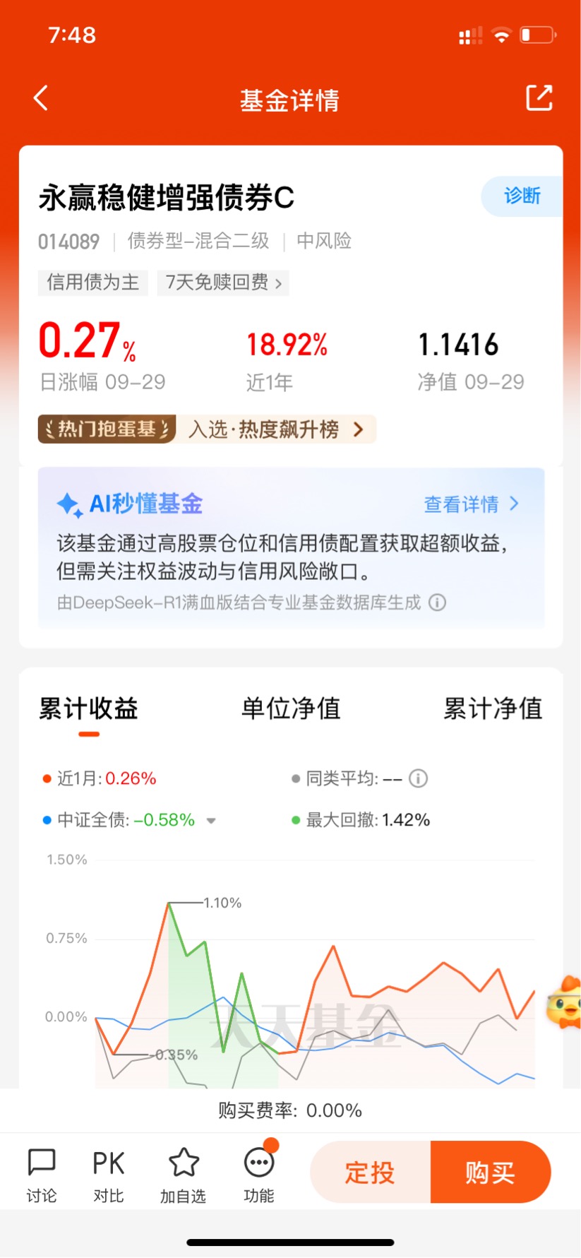 $永赢稳健增强债券C$ 今天收了27个蛋,开门红啊!永赢稳健增强是股债偏债的固收加基金,这里还是7天持有免手续费的,从这里的业绩表现来看,这里回撤控制的很好,可以说做长做短都很适合,近三个月734个蛋,近一年1877个蛋,双节来袭,我认为这里倒是很适合避险了! #老登股VS小登股!业内大佬“激辩”#