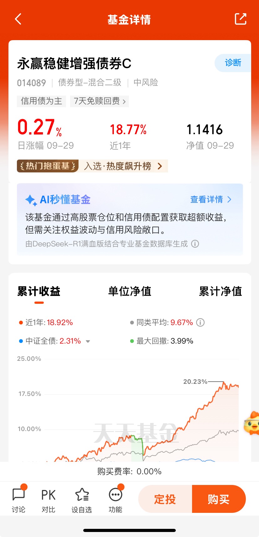 #长假来临 持基过节还是持币过节?# 在经济复苏节奏不确定、市场波动加剧的背景下,混债通过灵活的资产配置,有望更好地适应不同市场环境,成为投资者资产组合中重要的稳定器。$永赢稳健增强债券C$ 今天收27个蛋,近三个月收734蛋,近六个月1046个蛋,近1年收1877个蛋,各阶段的收蛋能力都不错;随着利率下行空间有限,纯债资本利得空间收窄,投资者对收益增强型产品的需求可能增加,混债作为“固收+”的典型代表,有望吸引更多资金流入。