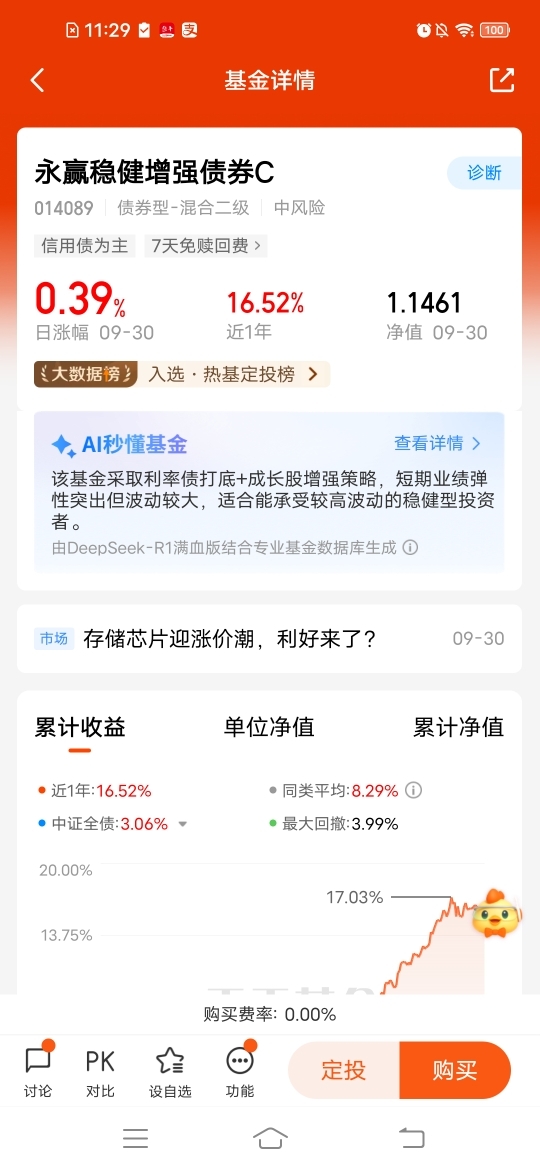 $永赢稳健增强债券C$挺适合稳健布局,固收加,近一周收24个蛋,近三个月收727