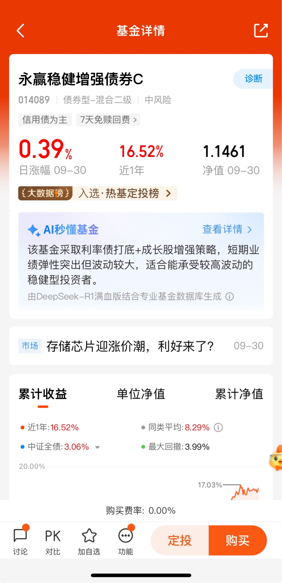 $永赢稳健增强债券C$ 前面最后一天收39个蛋,近3个月收727个蛋,近6个月收1079个蛋,近一年收1652个蛋,表现优秀!它是股债混合偏债的固收加基金,主要以信用债为主,利率债做波段,加上少量的可转债和股票增厚收益。固收类产品以债券等固定收益资产为主,波动性小于权益类资产,适合风险偏好较低的投资者!