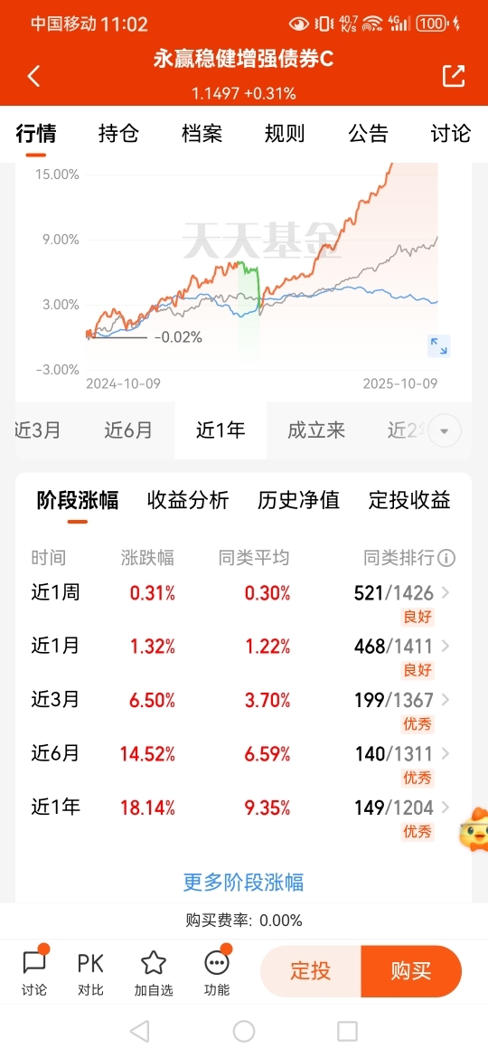 $永赢稳健增强债券C$ 持仓84.77%奠定收益基础, 同时配置19.88%股票仓位增强收益弹性,形成双轮驱动,前面一度六天五涨,近一周收31枚大蛋,近一个月收132枚大蛋,近半年收1452枚大蛋,近一年收1814枚大蛋,妥妥滴收蛋神器,近期混债表现不错,继续期待了#林园:A股仍处牛市前夜#