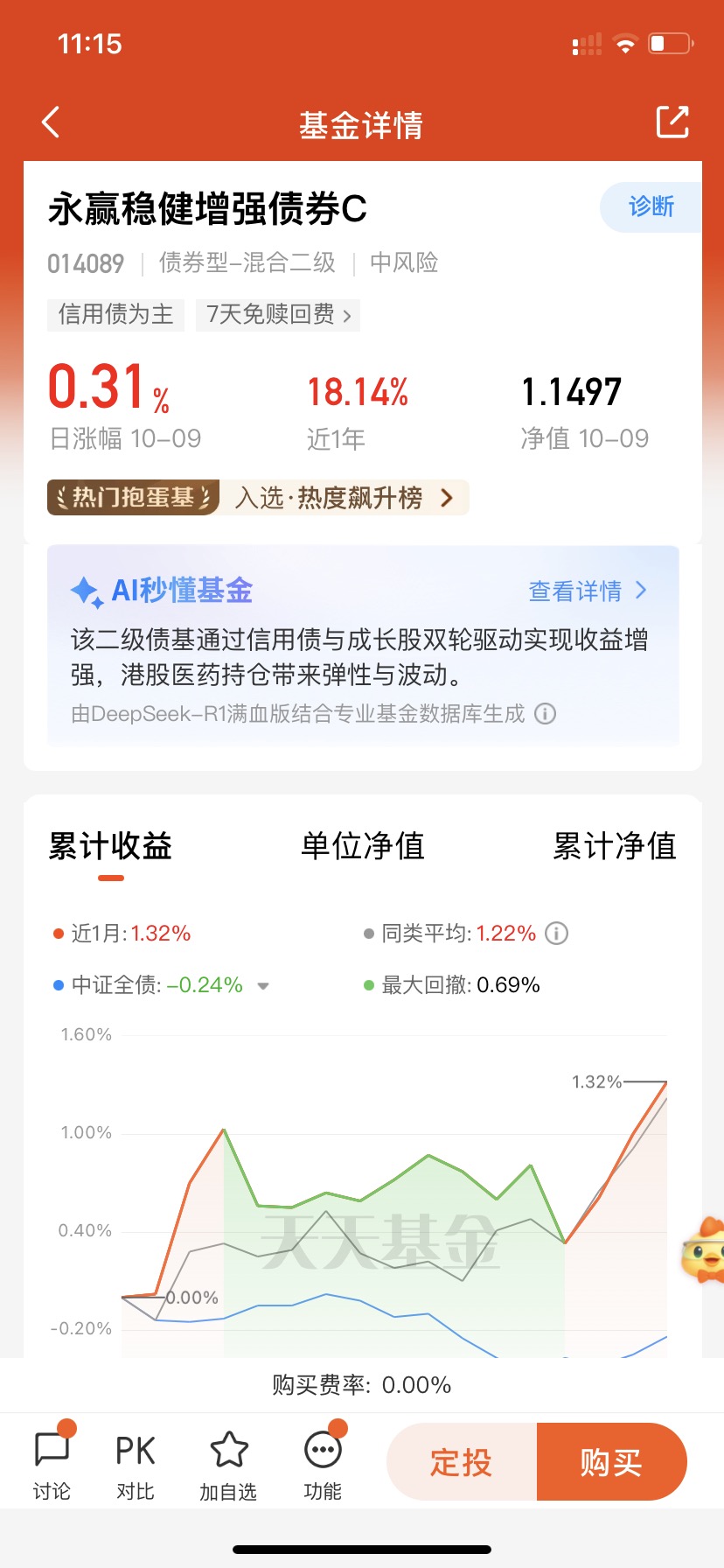 $永赢稳健增强债券C$ 昨天31个蛋收着,爽啊!永赢稳健增强是一只以信用债为主的固收加基金,该二级债基通过信用债与成长股双轮驱动实现收益增强,这里主要以信用债和利率债固收打底,加上少量的可转债和股票增厚收益,近半年650个蛋,近一年1814个蛋,业绩表现出色的很咯!#10月你看好哪些投资赛道?#