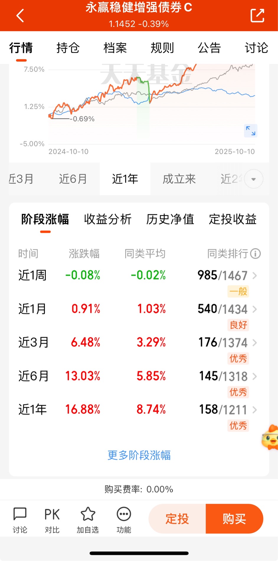 $永赢稳健增强债券C$ 最近可以加仓起来了,近一个月收91个蛋,近3个月收648个蛋,近 6个月收1303个蛋,近一年收1688个蛋,表现优秀!该基持仓61.55%信用债+23.19%利率债+19.88%股票,债券兼顾票息收益与资本利得,对冲市场波动。信用债打底,持有稳稳的省心,七天免赎回费的固收债基!