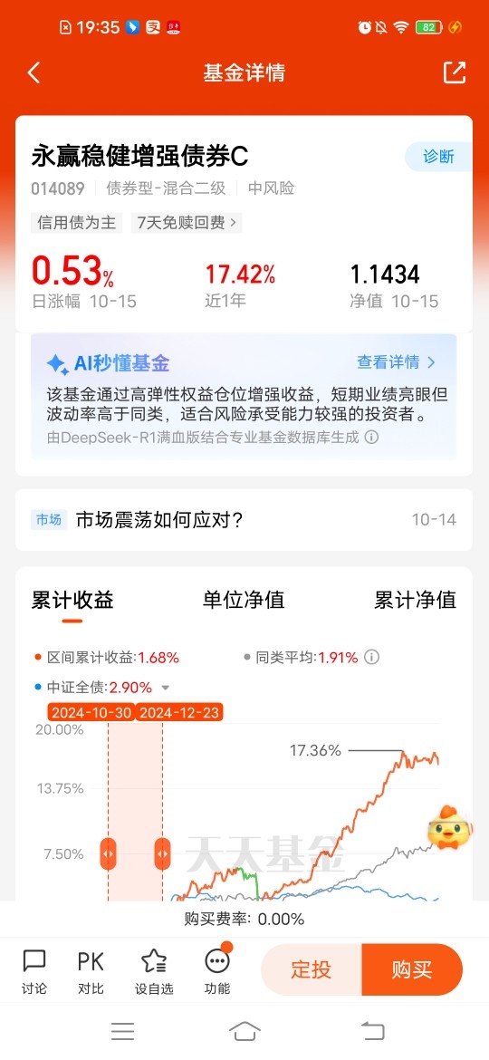 $永赢稳健增强债券C$ 固收加俩不误,今晚更新收53个蛋,近三个月收519个蛋,近半年收1231个蛋,近一年收1742个蛋,各个阶段业绩超额,中长期更值得期待,只配置权益风险大,当下均衡配置更适宜。较高仓位债券打底,再配置一定股票来增强收益,攻守兼备,也比较适合震荡市场,更适合稳健布局!#3900点得而复失!A股风格要改了?#
