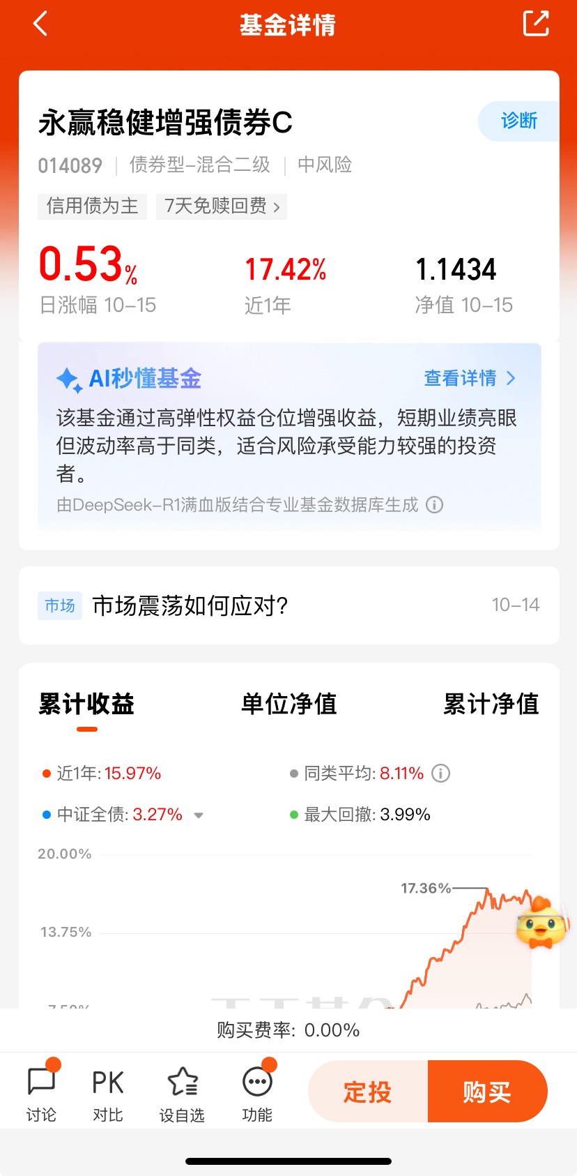 #分享国庆见闻,晒收益,瓜分好礼!# 在债券收益率下行背景下,混债基金作为“固收+”产品,可满足投资者对收益和风险的平衡需求,规模或稳步增长。$永赢稳健增强债券C$ 今天收53个大蛋,近三个月收519蛋,近六个月1231个蛋,近1年收1742个蛋,各阶段的收蛋能力都不错;通过债券打底控制风险,叠加股票或可转债增强收益,适合风险偏好较低但追求稳健增值的投资者。