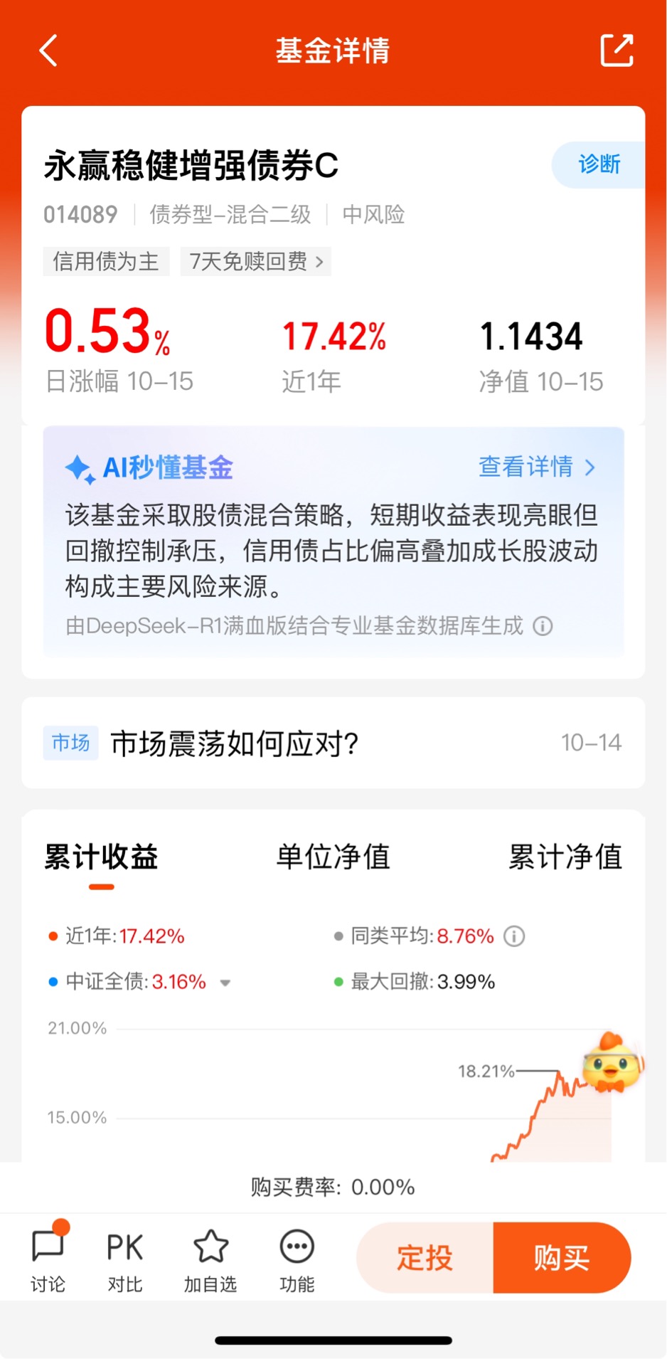 $永赢稳健增强债券C$ 昨天涨回来53个蛋,近3个月收519个蛋,近6个月收1231个蛋,近一年收1742个蛋,各个阶段表现优秀,还有发展空间哈!作为绩优固收+代表,近期表现稳健。产品以高等级信用债为核心持仓,搭配利率债优化久期,构建稳健收益基础!