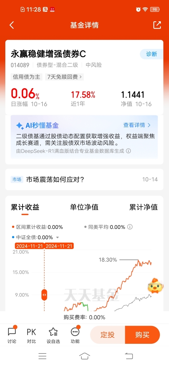 $永赢稳健增强债券C$ 固收加,稳妥点,能涨抗跌,昨天收6个蛋,近一个月收28个蛋,近半年收1300个蛋,近一年收1758个蛋,收大蛋次数多,中长期更有优势,只配置权益风险大,当下均衡配置更适宜。较高仓位债券打底,再配置一定股票来增强收益,进退皆宜,也比较适合震荡市场布局。#分享国庆见闻,晒收益,瓜分好礼!#