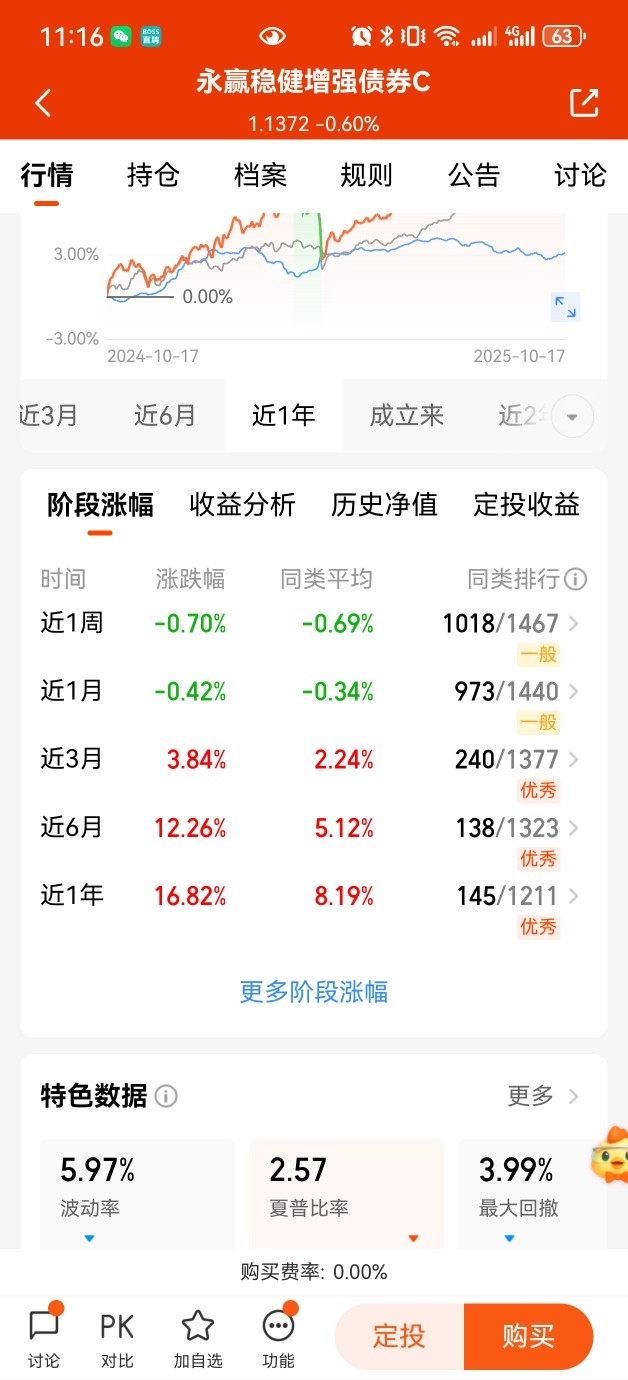 当前市场环境下,配置"固收+"产品正成为平衡风险与收益的明智选择。$永赢稳健增强债券C$ 以“债基打底+权益增强”的黄金组合来获取超高额回报,近三个月收384个蛋,近六个月收1226个蛋,近一年收1682个蛋,弹性不错,用来做均衡配置妥妥滴。#亚太股市杀跌 市场开启避险模式?#