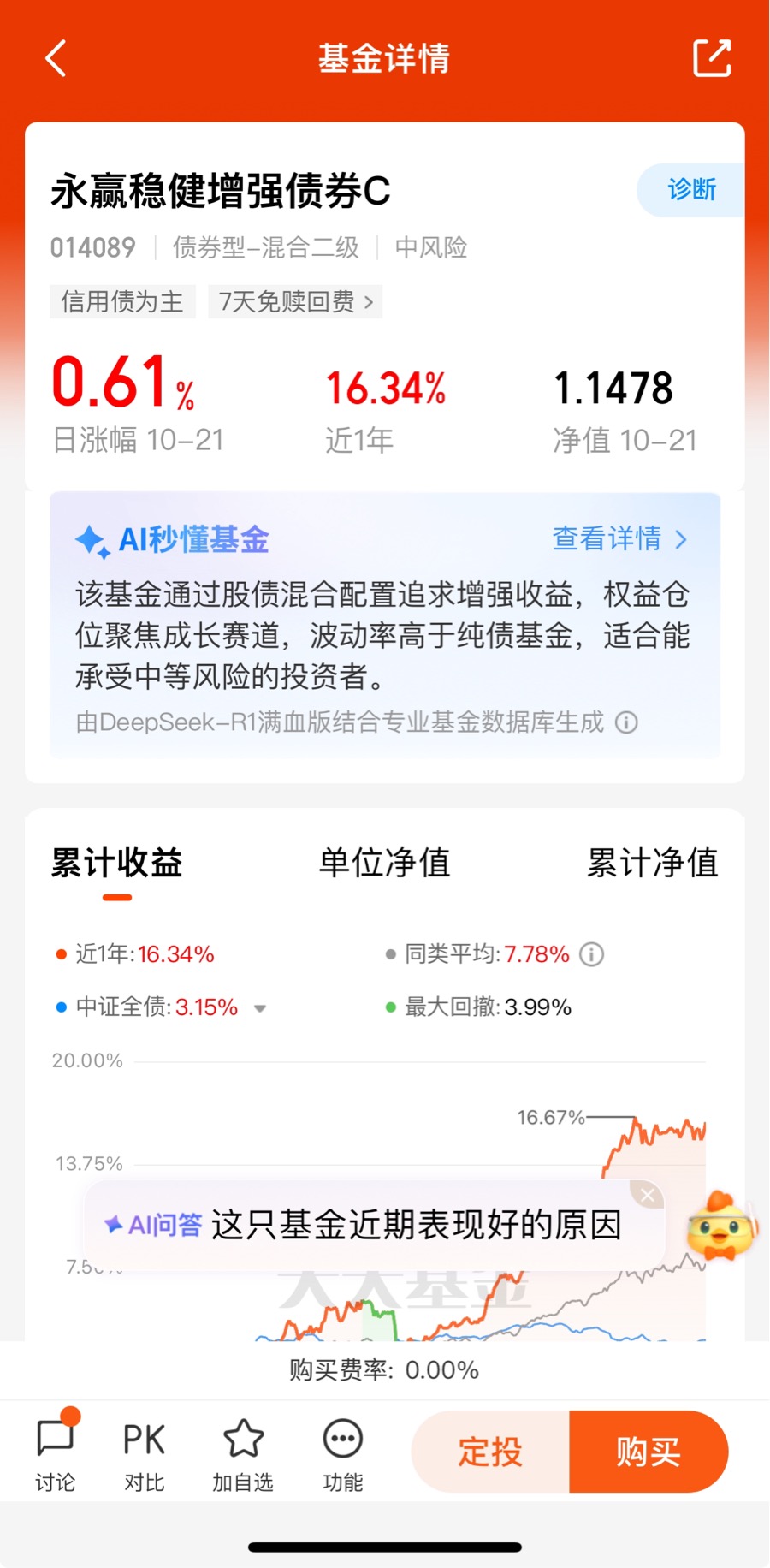 $永赢稳健增强债券C$ 昨天收61个蛋,近3个月收470个蛋,近6个月收1303个蛋,近一年收1634个蛋,表现优秀!这只基金采用的“债券打底、权益增强”策略,可以说是“固收+”产品的黄金组合。它以**高等级信用债为主要底仓,再辅以利率债来优化组合久期,构建起稳健的收益基础。在权益部分,则重点配置低估值、高股息的个股,同时搭配可转债来增强组合弹性,使得基金在不同市场环境下都能应对自如。