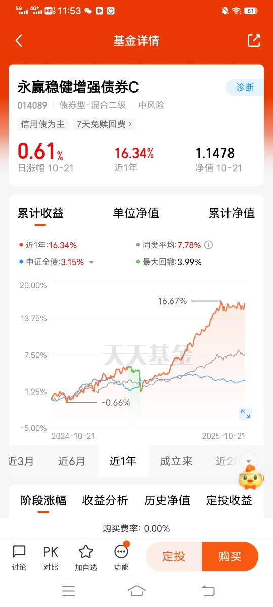 行情回暖来了。债市连涨几天啦,$永赢稳健增强债券C$昨晚收61颗蛋。近一周收91