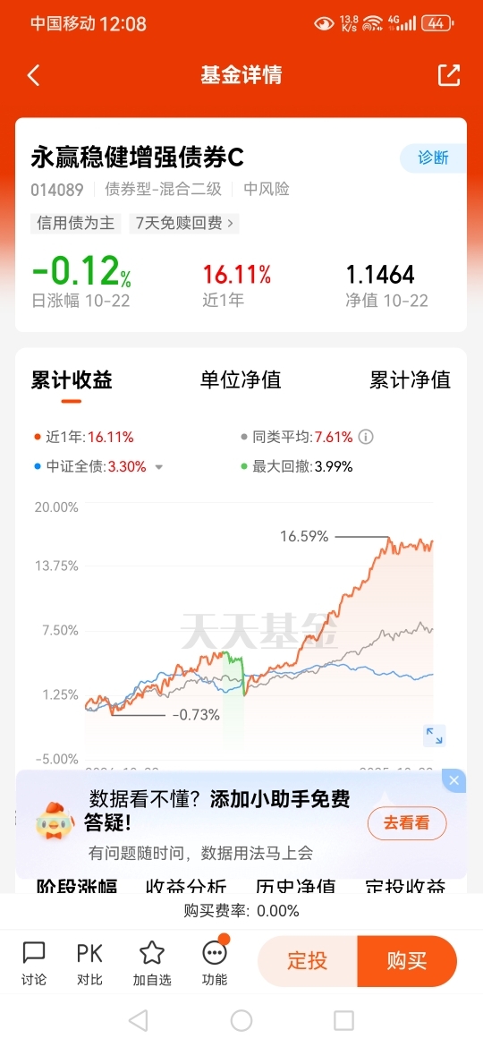#CPO、PCB大反攻!行情空间有多大?# 目前行情走势看,配点$永赢稳健增强债券C$ 来做打底配置也是可以的。这支采用"债基打底+权益增强"的黄金组合,其底层债券持仓以高等级信用债为主,搭配利率债优化久期,形成稳健收益基础。权益部分精选低估值、高股息标的,辅以可转债增强弹性,确保在市场波动中进退有据。这种严谨的策略使产品业绩表现持续亮眼,近一年涨幅+16.11%。